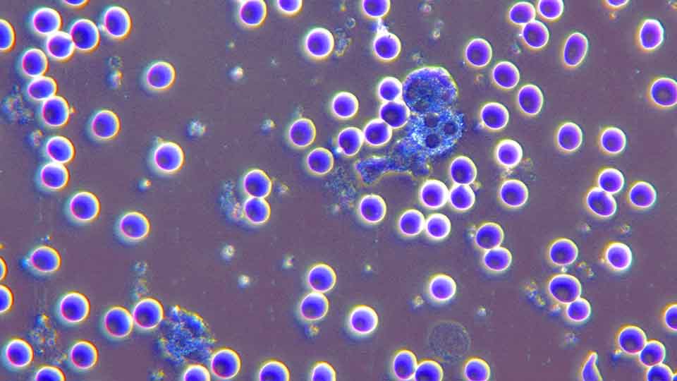 The size and mobility of the white blood cells is of great importance as it shows us the vitality of our immune system. It can be observed in an impressive way with dark field microscopy. The image from the microscope is displayed in real time on a large screen so that it can be discussed with the patient.